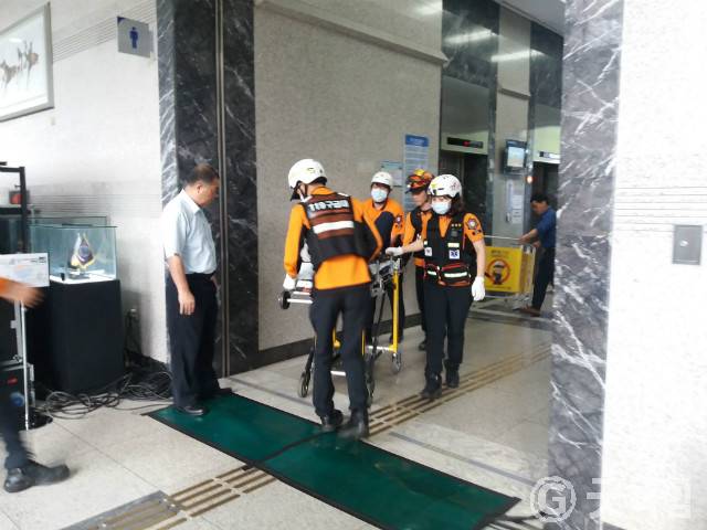 [굿타임] = 이강부 기자 = 천안시는 시청사 1층 로비에서 승강기 사고대응 시범훈련을 실시했다.
