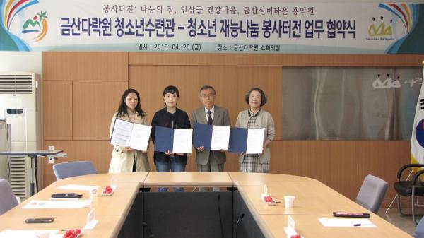 [굿타임] = 이강부 기자 = 금산다락원청소년수련관은 소회의실에서 청소년 재능나눔 봉사터전 나눔의집을 비롯한 인삼골건강마을과 금산실버타운 홍익원과 업무 협약을 체결했다.