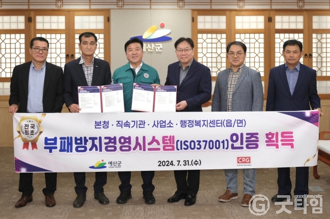 [굿타임] = 이강부 기자 = 예산군은 글로벌인증기관(JAS-ANZ호주등록)인 CPG인증원으로부터 군 전부서(본청, 직속기관, 사업소, 읍면행정복지센터)를 대상으로 약2주간의 심사를 진행한 결과 부패방지경영시스템(ISO 37001) 인증을 획득했다.