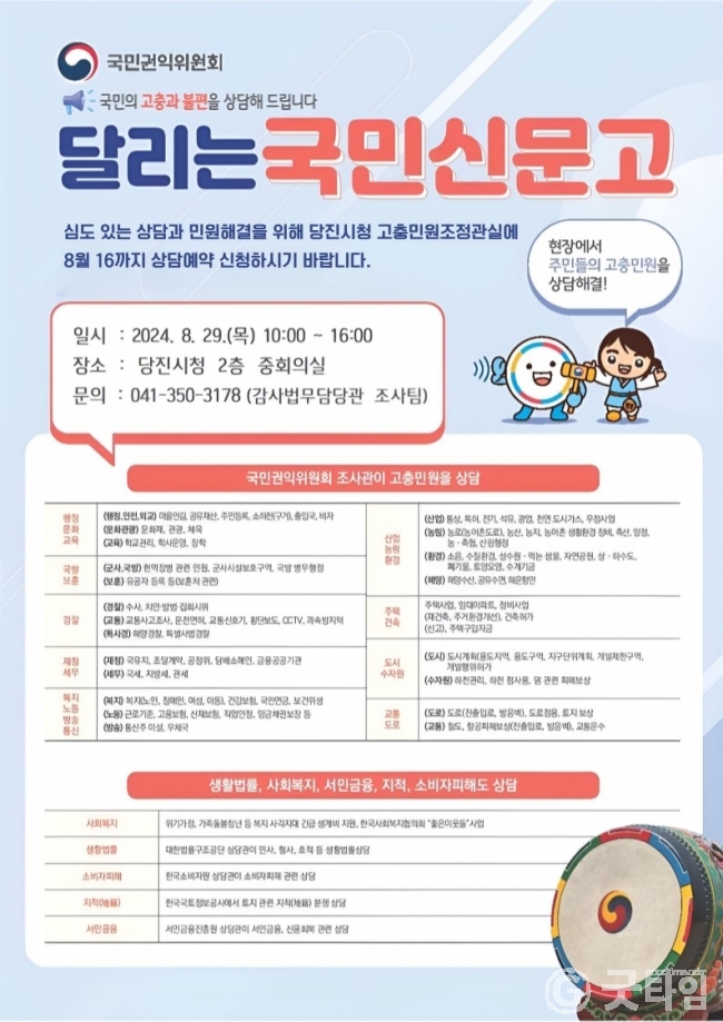 [굿타임] = 이강부 기자 = 당진시는 국민권익위원회와 함께 오는 29일 오전 10시부터 오후 4시까지 당진시청 2층 중회의실에서 달리는 신문고를 개최한다.