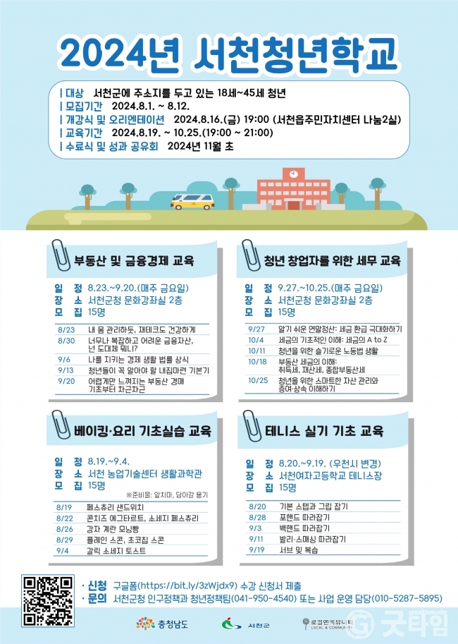 [굿타임] = 이강부 기자 = 서천군은 청년의 다양한 문화 여가 활동을 지원코자 오는 12일까지 청년학교 참여자를 모집한다.
