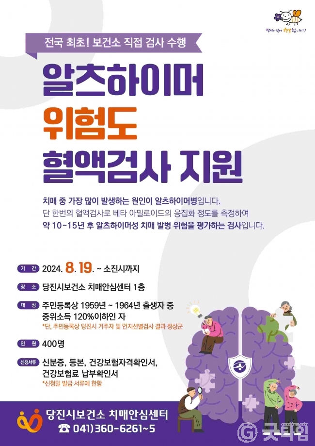 [굿타임] = 이강부 기자 = 당진시보건소는 오는 19일부터 보건소 직접 사업인 알츠하이머 치매 위험도 혈액검사를 운영한다.