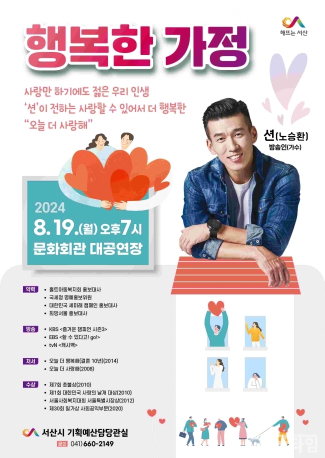 [굿타임] = 이강부 기자 = 서산시는 오는 19일 오후 7시 서산시 문화회관 대공연장에서 다둥이 아빠 가수 션이 전하는 행복한 가정을 주제로 강연을 개최한다.