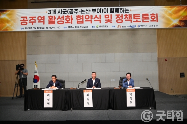 [굿타임] = 이강부 기자 = 박정현 군수는 공주시 아트센터고마에서 열린 공주, 논산시와의 공주역 이용 활성화와 상생 발전을 위한 업무협약에서 공주역 명칭 변경을 제안했다.