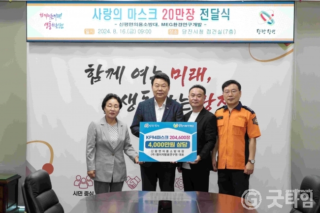 [굿타임] = 이강부 기자 = 당진시 신평면의용소방대, MEG환경연구개발의 안성순 대표가 당진시를 방문해 사랑의마스크 20만1600장(4000만원 상당)을 기부했다.