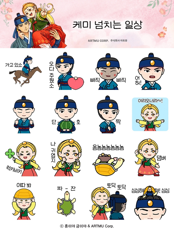 남이흥 장군과 거북재 거북바위 설화 모티브 캐릭터인 신령 황금이의 카카오톡 이모티콘은 케미 넘치는 일상을 주제로 16종으로 구성됐으며 일상적인 표현이 가능토록 가고 있소, 이따 봐를 비롯해 예의를 중시하는 남이흥과 말괄량이 신령 황금이만의 색다른 케미를 볼수 있도록 표현했다.