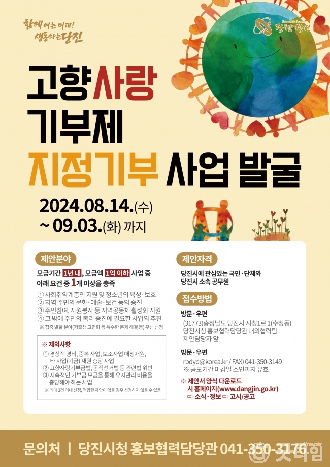 [굿타임] = 이강부 기자 = 당진시는 지난 14일부터 오는 9월3일까지 고향사랑기부제 지정 기부 사업 발굴을 진행한다.