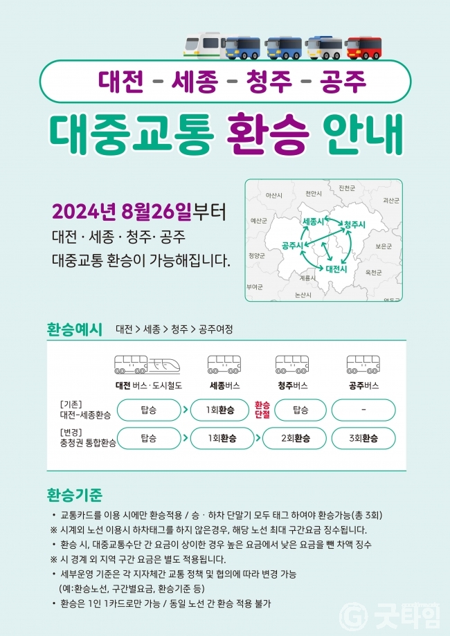 이에 따라 오는 26일부터는 기존 대전과 세종간에 적용되던 대중교통 환승할인을 청주와 공주까지 확대해 받을수 있게 된다.