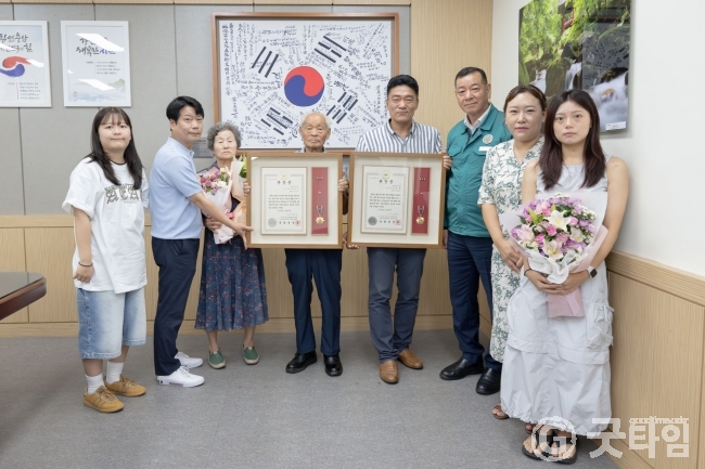 [굿타임] = 이강부 기자 = 공주시는 시청 상황실에서 6·25전쟁 참전 유공자인 고 박천문, 희문 형제의 유가족에게 화랑무공훈장과 훈장증을 전달했다.