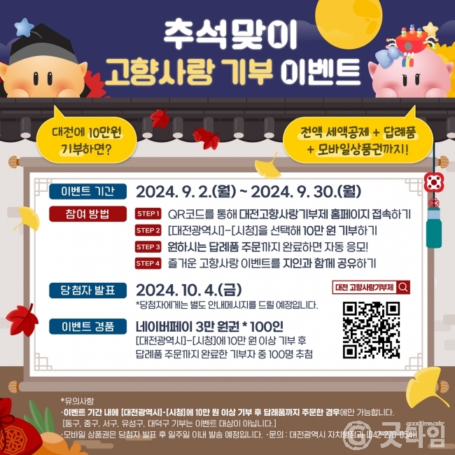 [굿타임] = 이강부 기자 = 대전시는 민족 대명절 추석이 있는 9월을 맞아 2일부터 30일까지 한달간 대전 고향사랑기부 경품 이벤트를 진행한다.