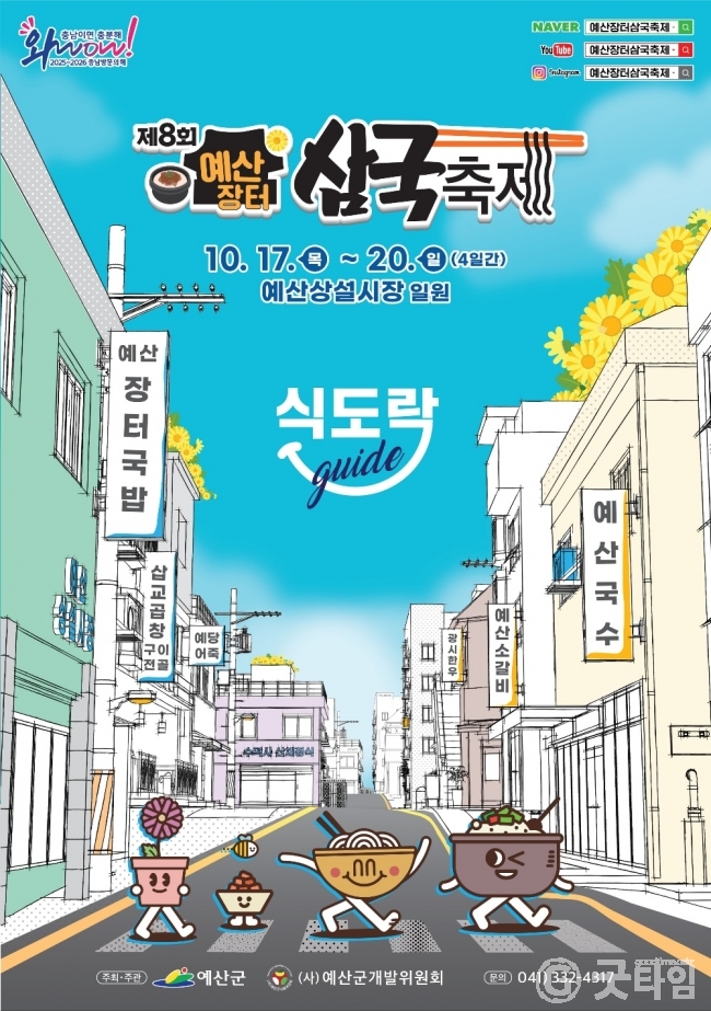 한편 제8회 예산장터 삼국축제는 오는 10월17일부터 20일까지 예산상설시장 일원에서 예산장터로 식도락 여행을 떠나자를 슬로건(주제)으로 개최될 예정이다.