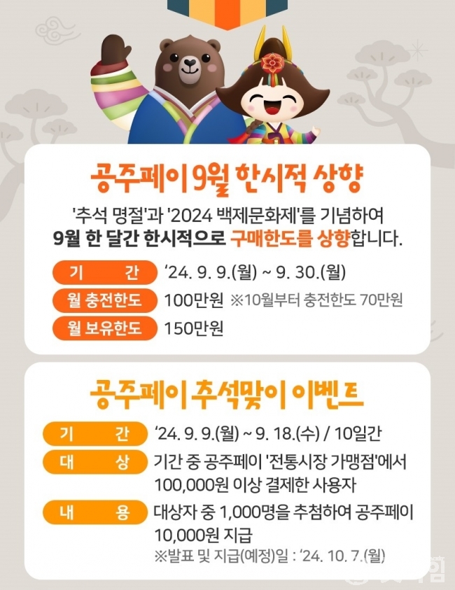 [굿타임] = 이강부 기자 = 공주시가 추석 명절과 제70회 백제문화제를 기념해 9월 한달 동안 공주페이 충전 한도를 100만원으로 상향한다.