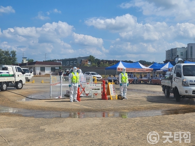 [굿타임] = 이강부 기자 = 논산시는 가축전염병 방역 대응 능력을 강화키 위해 아프리카돼지열병(ASF)과 구제역(FMD) 방역 가상훈련을 실시했다.