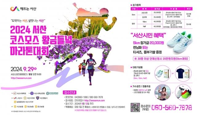 [굿타임] = 이강부 기자 = 서산시는 2024 서산 코스모스 황금들녘 마라톤대회를 오는 29일 서산스포츠테마파크 일원에서 개최한다.