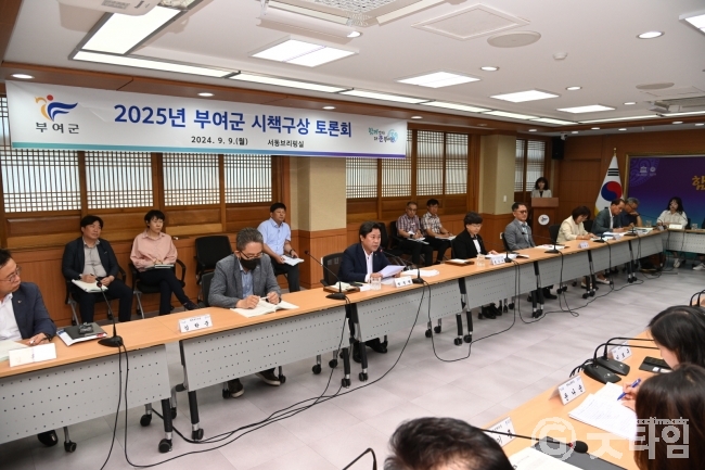 [굿타임] = 이강부 기자 = 부여군은 군청 브리핑실에서 박정현 군수를 비롯해 부군수, 국장 등 전 부서장이 참석한 가운데 2025년 시책구상 토론회를 개최했다.