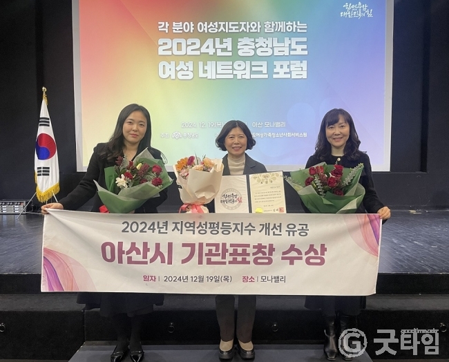 [굿타임] = 이강부 기자 = 아산시는 2024년 지역양성평등지수 개선 유공 분야에서 충청남도지사 우수기관, 우수공무원, 민간인 부문 표창을 받았다.