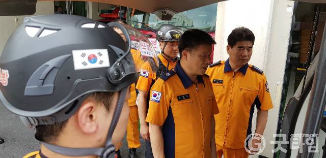 [굿타임] = 이강부 기자 = 손정호 대전소방본부장은 6일 오후 연일 40도에 육박하는 폭염의 날씨가 계속되는 가운데 폭염과 싸우고 있는 현장출동대원들을 찾아 격려했다.