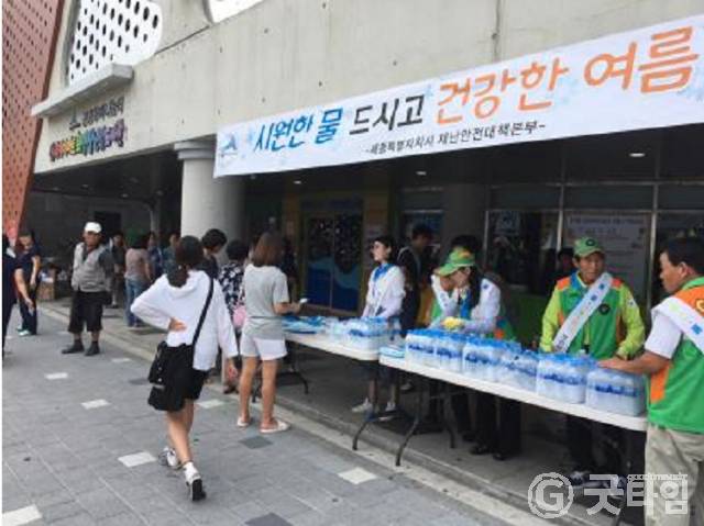 [굿타임] = 이강부 기자 = 세종시가 9일 조치원읍 일원에서 시민들에게 얼음생수 나눔 행사를 열었다.