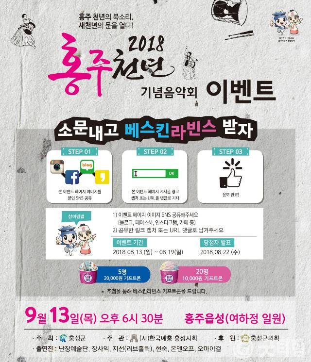 [굿타임] = 이강부 기자 = 홍성군의 대표적인 소셜미디어 채널인 홍성군 페이스북 함께하는 홍성이야기는 2018 홍주천년 기념음악회 개최 소식을 알리며 기념 이벤트를 진행한다.