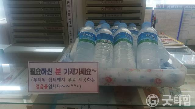 [굿타임] = 이강부 기자 = 홍성군 장곡면 행정복지센터는 방문한 민원인들이 잠시나마 더위를 달랠 수 있도록 생수를 얼려 방문하는 민원인 누구나 가져갈 수 있도록 민원실에 비치 배부하고 있어 주민들의 좋은 반응을 얻고 있다.