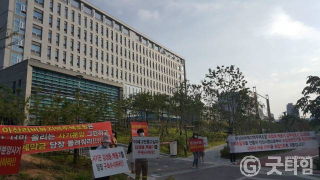 [굿타임] = 이강부 기자 = 아산리버뷰지역주택조합의 조합원들이 20일 오전 천안지방검찰청 앞에서 아산경찰서의 정확한 수사 촉구와 검찰과 법원의 정확한 심판을 촉구하는 집회를 가졌다.