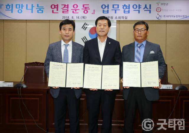 군은 군청 소회의실에서 (사)희망을 나누는 사람들, ㈜네이처영농조합법인과 업무협약을 체결해 희망나눔 연결운동의 힘찬 시작을 알렸다.