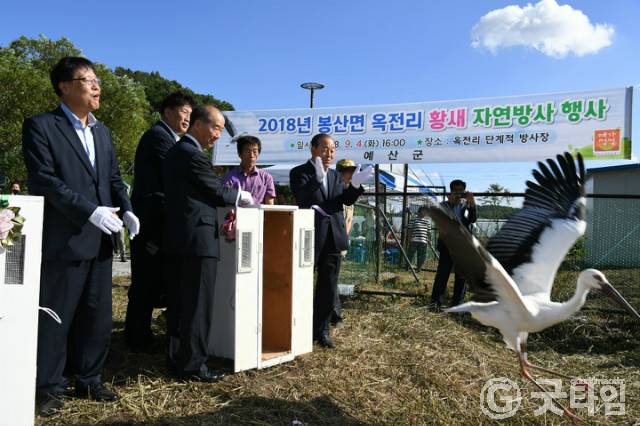 이날 황새 자연방사 행사는 황선봉 군수와 이승구 군의회 의장, 친환경농업인단체, 마을 주민 등 200여 명이 참석한 가운데 황새 복원의 의미를 되새기고 청정지역 예산군의 이미지를 제고하고자 마련됐다.