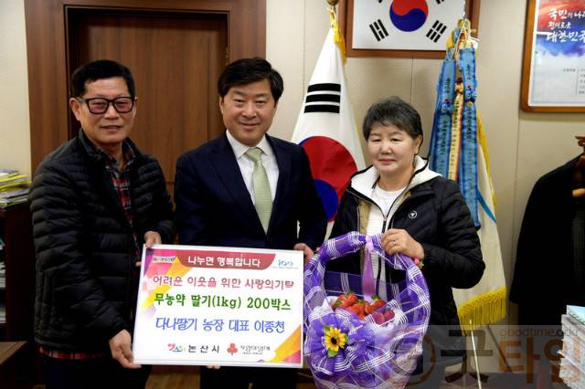 [굿타임] = 이강부 기자 = 논산시 다나딸기 농장 이종천대표는 13일 논산시청을 방문 자신이 직접 재배한 무농약 딸기 200상자를 기탁했다.