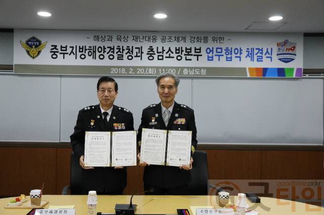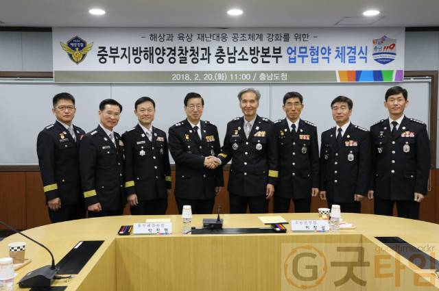 [굿타임] = 이강부 기자 = 충남소방본부는 중부지방해양경찰청과 손을 잡고 육상과 해상에서 재난대응 업무의 공조체계를 강화한다.