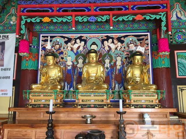 [굿타임] = 이강부 기자 = 청양군 장평면 화산리 정혜사 대웅전에 봉안되어 있는 청양 정혜사 목조석가여래삼불좌상이 충남도 유형문화재 제241호로 지정됐다.