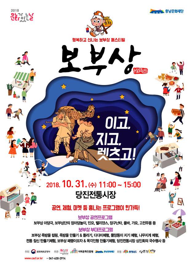 특히 이번 행사는 충남의 대표 보부상단 중 하나인 예덕상무사 보부상놀이보존회가 참여해 보부상 장마당놀이와 전통체험을 진행하며 충남소상공인연합회의 문화공연팀과 당진전통시장 상인회의 국수잔치와 연계해 다양한 프로그램을 선보일 예정이다.