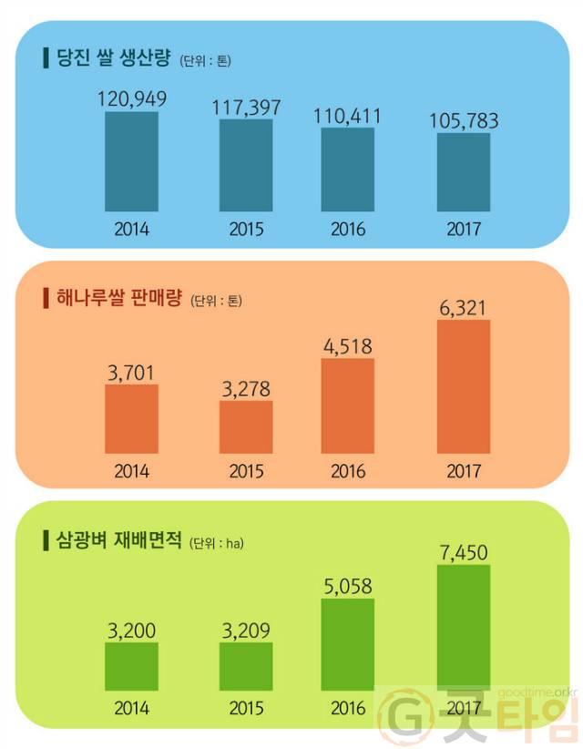 [굿타임] = 이강부 기자 = 2014년과 비교해 3년이 지난 2017년 당진지역의 쌀 생산량은 감소한 반면 지역 브랜드 쌀인 해나루쌀의 판매량은 증가한 것으로 나타났다.