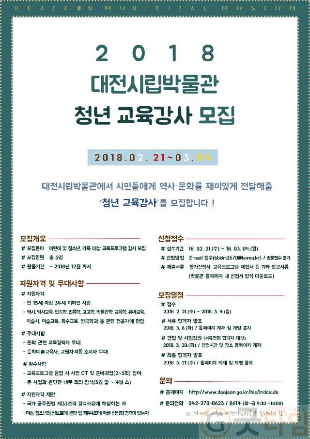 지원서는 대전시립박물관 홈페이지에서 내려 받을 수 있으며 1차는 서류심사와 2차 면접과 시범강의를 거쳐 3월 31일 최종합격자를 발표할 예정이다.