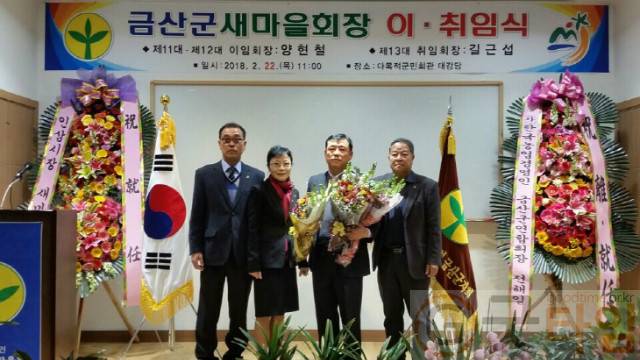 (사)금산군새마을회는 22일 다목적군민회관 대강당에서 양현철 이임회장, 길근섭 취임회장, 임동규 충남도새마을회장 등 지역 기관 단체장 80여명이 참석한 가운데 이취임식 행사를 가졌다.이날 양현철 이임회장에 대한 공로패 전달과 이임사에 이어 길근섭 신임회장의 취임사와 새마을회기 이양 등의 순서로 진행됐다. 취임사를 통해 길근섭 금산군새마을회장은 "지역사회를 위한 자원봉사활동에 우선을 두고 시대에 걸맞는 새마을운동으로 변화하는 모습을 보여드리겠다"고 말했다.금산군새마을회는 새마을지도자금산군협의회, 금산군새마을부녀회, 새마을문고 금산군지부, Y-SMU금산포럼 등 4개의 회원단체로 구성돼 있으며 김장나누기, 밑반찬나누기, 연탄봉사, 집고쳐주기, 벽화그리기, 어르신 장수사진 찍어드리기, 홀몸노인 목욕봉사 등 지역사회에서 많은 자원봉사활동으로 모범을 보이고 있다.