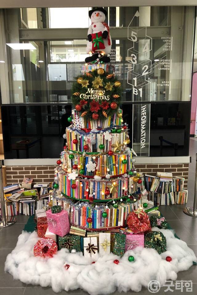 아산시립도서관은 구입도서 책 커버를 이용해 만든 크리스마스 트리를 중앙도서관 1층 로비에 설치했다.