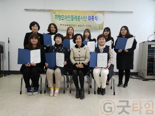 [굿타임] = 이강부 기자 = 부여군은 23일 부여성폭력상담소 제6기 희망모아민들레봉사단 발대식과 함께 새롭게 구성된 10명의 자원봉사자에게 위촉장을 수여했다.
