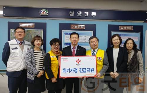 [굿타임] = 이강부 기자 = 천안시 쌍용3동은 28일 동장실에서 대한적십자사 천안사무소 천안지구협의회 이홍구 회장, 박말순 실장, 이광준 본부장 외 봉사원 3명이 참석한 가운데 대한적십자사 희망풍차 긴급지원비 전달식을 가졌다.