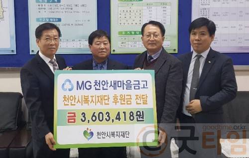 [굿타임] = 이강부 기자 = 천안새마을금고는 27일 청룡동 취약계층지원을 위해 사용해 달라며 후원금 360만3418원과 백미 294kg을 천안시복지재단에 전달했다.