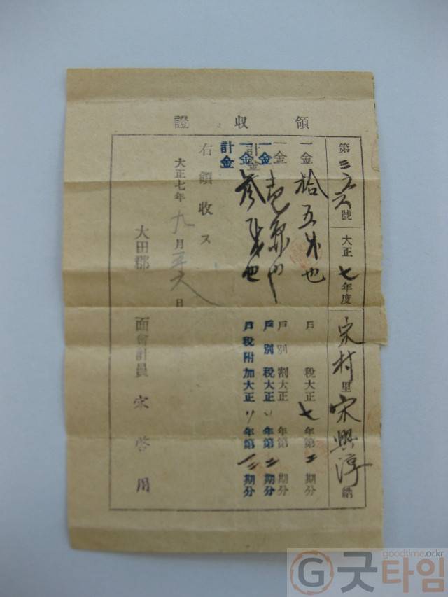 납세영수증은 대전군(大田郡) 회덕면(懷德面) 송촌리(宋村里) 현 대전광역시 대덕구 송촌동에 사는 송흥순이 일제강점기인 1918년 제2기분 세금을 납부하고 발급받은 납세영수증으로 세목은 호세, 호별할, 호별세, 호세부가로 구성돼 있다.