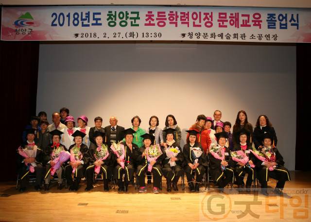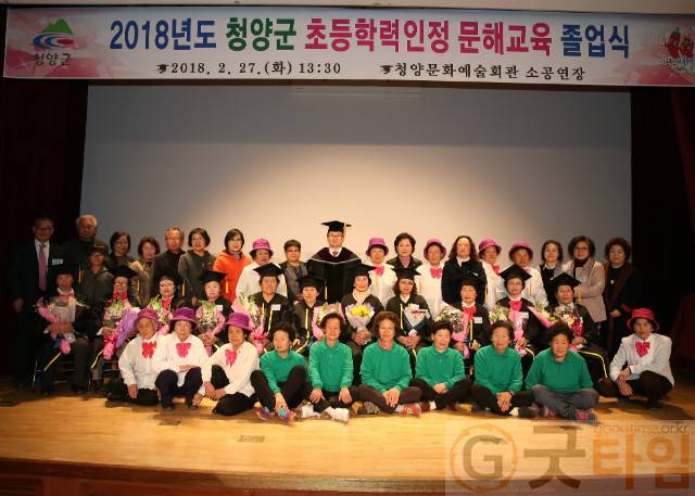 [굿타임] = 이강부 기자 = 청양군은 지난 27일 청양문예회관에서 성인문해교육 졸업생 14명과 학습자, 가족 등100여명이 참석한 가운데 2018년 초등학력인정 문해교육 졸업식을 개최했다.