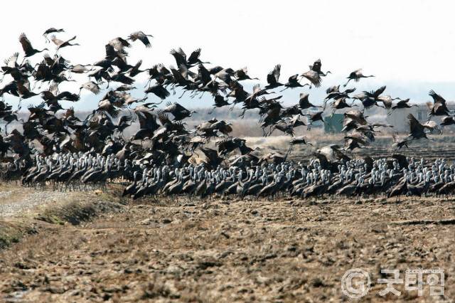 서산시에 따르면 고북면 사기리 간월호 지역에 조성한 4만7367㎡ 면적의 무논지역에 일본 이즈미 지역과 전남 순천만 등지에서 월동 후 북상중인 흑두루미 무리 2000여 마리가 찾아 해질 무렵 장관을 이루고 있다.