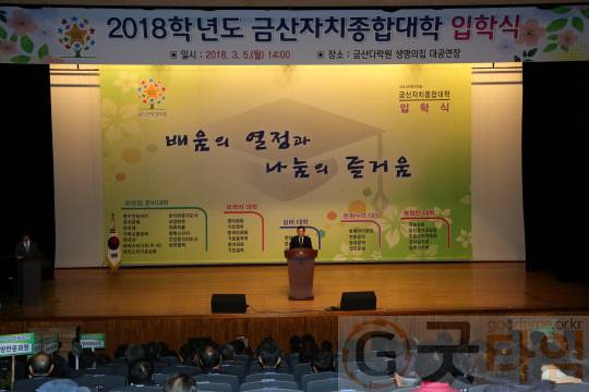 [굿타임] = 이강부 기자 = 배움의 열정과 나눔의 즐거움이라는 슬로건 아래 금산군이 주최하고 금산교육사랑장학재단에서 운영하는 2018년 금산자치종합대학 입학식이 5일 금산다락원 대공연장에서 성황리에 개최됐다.