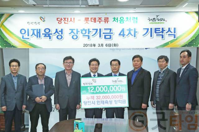 [굿타임] = 이강부 기자 = ㈜롯데주류 이종훈 대표이사는 6일 당진시청을 방문해 장학금 1200만원을 (재)당진장학회에 전달했다.