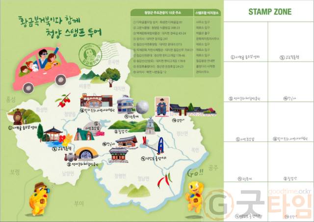 [굿타임] = 이강부 기자 = 청양군은 이달부터 오는 12월까지 황금복거북이 캐릭터를 활용한 청양 관광 스탬프투어 이벤트를 운영한다.