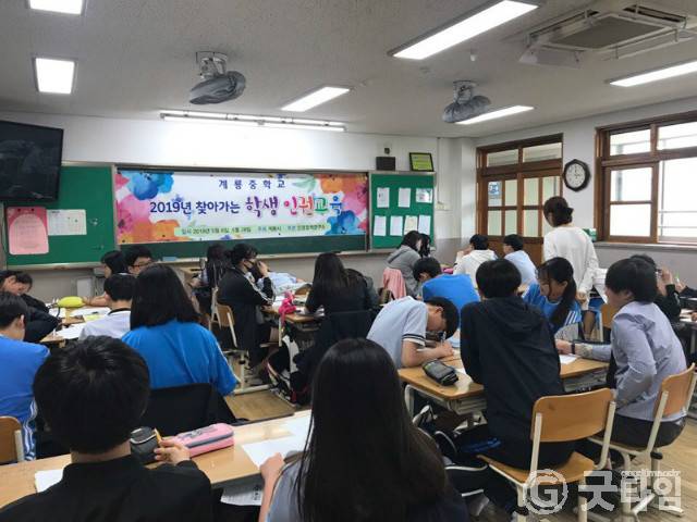 계룡중학교에서 중학생 100여명을 대상으로 진행된 1차 교육은 인권정책연구소의 조혜욱 강사를 초빙해 나와 타인을 존중하는 건전한 사고와 인권에 대한 올바른 이해를 도왔다.