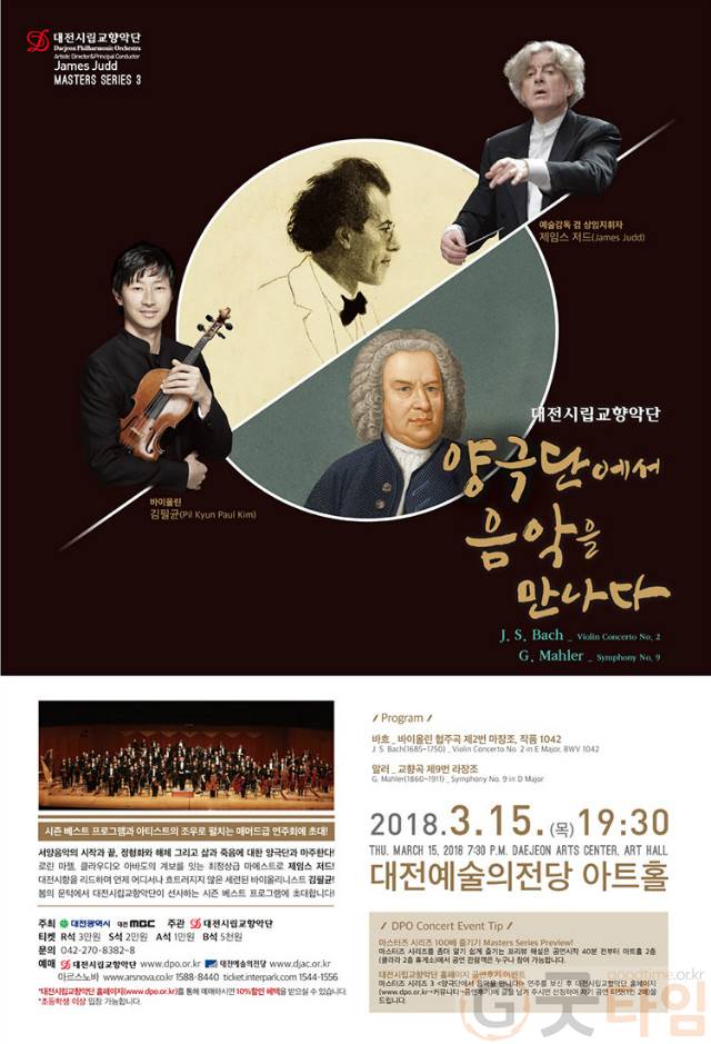 이번 연주는 로린 마젤, 클라우디오 아바도의 계보를 잇는 최정상급 마에스트로 제임스 저드 예술감독 지휘로 대전시향을 리드하며 언제 어디서나 흐트러지지 않는 세련된 바이올리니스트 김필균의 협연으로 서양 음악의 아버지 바흐의 바이올린 협주곡 제2번 마장조, 작품 1042와 말러가 삶의 끝에서 말하는 마지막 고백 교향곡 제9번 라장조를 연주하며 서양 음악의 시작과 끝을 선보인다.