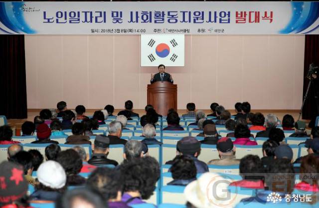 태안군은 8일 군청 대강당에서 한상기 군수를 비롯한 장정근 태안시니어클럽 관장과 성일종 국회의원, 이용희 군의장, 김형근 태안교육장, 노인일자리 참여자 등 300여명이 참석한 가운데 2018 노인일자리와 사회활동 지원사업 발대식을 개최했다.