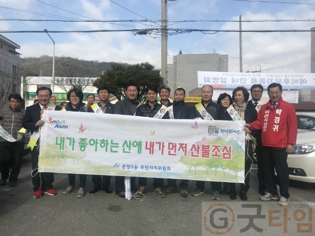 통장협의회, 행복키움추진단, 여성자원봉사단, 노인회 등 8개 단체 100여명은 온양5동 주민센터에 모여 주민들이 많이 다니는 아파트 주변을 경유하면서 산불예방 전단지를 배부하고 자연정화활동을 병행하고 관용차를 통한 홍보 방송을 통해 산불예방 홍보활동을 대대적으로 펼쳤다.