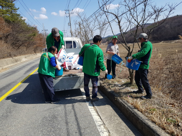 새마을지도자 15명이 참여해 지석리부터 만지리까지 약7km 구간의 산수유 가로수 1500그루가 잘 자라도록 불필요한 나뭇가지를 자르고 거름을 줬다.