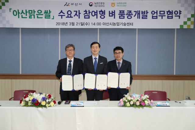 이에 국립식량과학원, 농협중앙회 아산시지부와 21일 dk산시청 상황실에서 관계자 등 17명이 참여한 가운데 아산 맑은 쌀 전용 품종 개발 MOU 체결식을 가졌다.